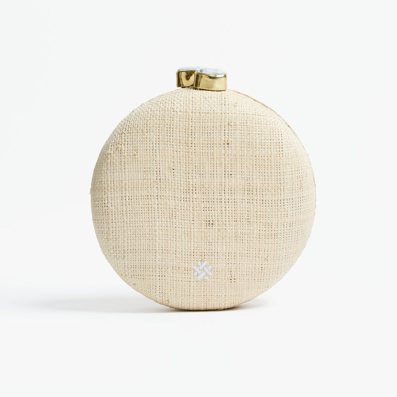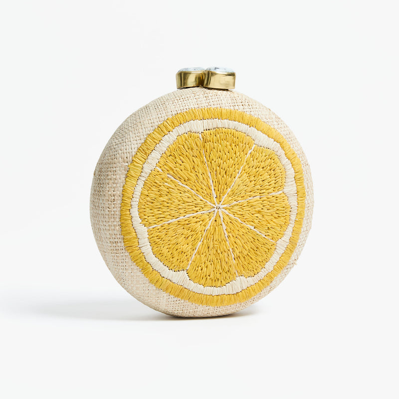 - Straw minaudière with hand-embroidered lemon motif and semi-precious stone closure