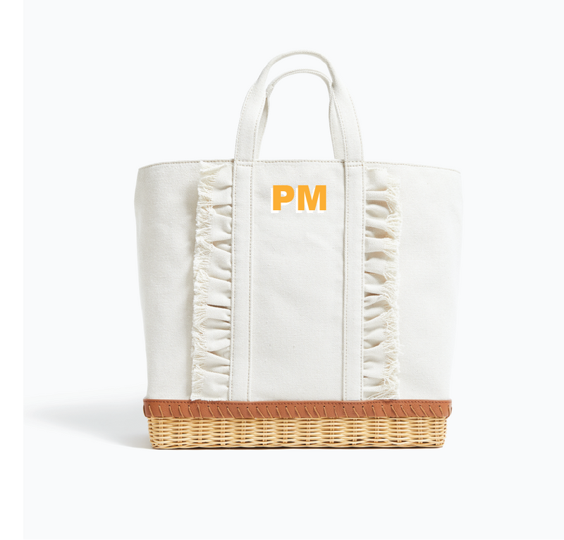 - Handwoven, natural rattan based canvas tote with leather whipstitch and trim