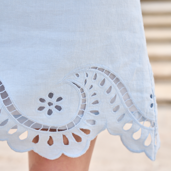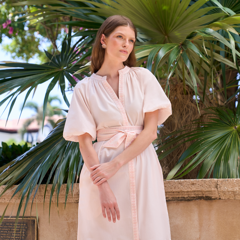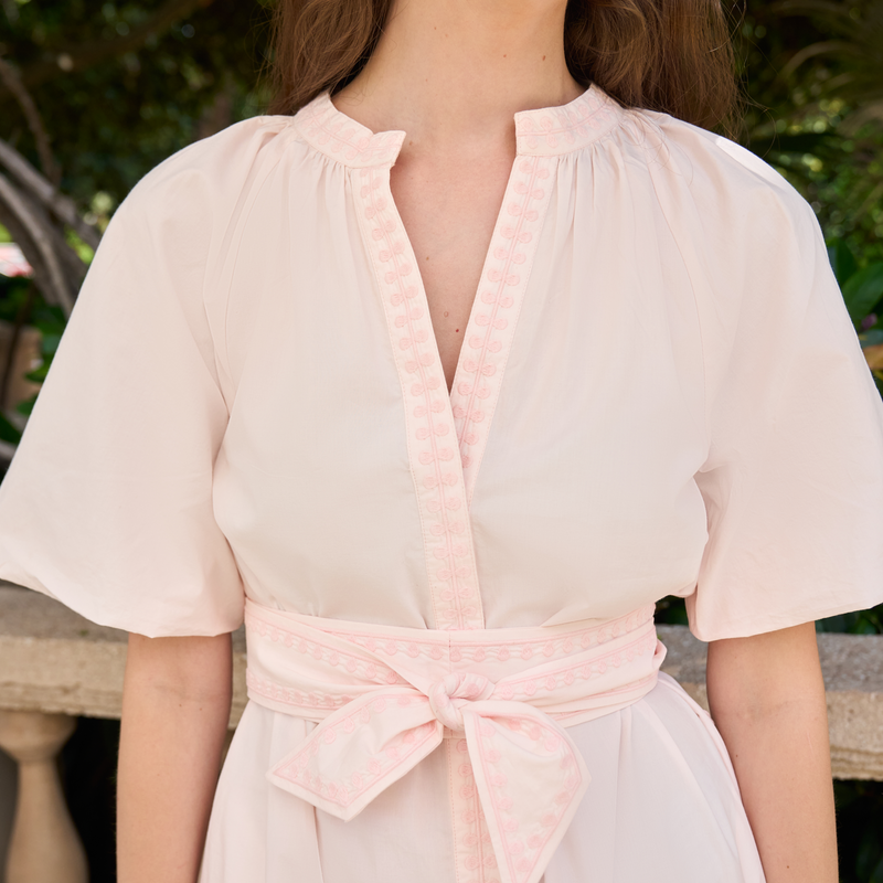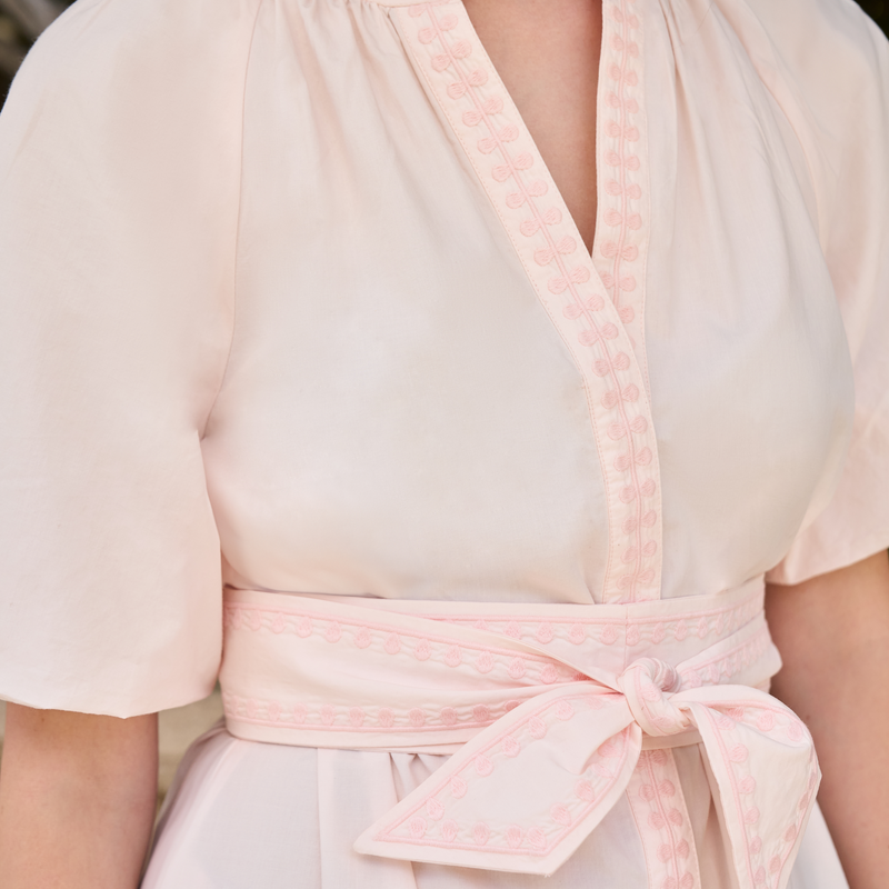 Soft pastels, embroidered flourishes and timeless tailoring bring ease to dressing, wherever the season takes you. Our new Lulu dress is crafted in airy cotton and finished with tonal embroidery along the neckline, placket and hem. A subtle gathered neckline, voluminous sleeves and detachable tie belt lend feminine structure to its relaxed silhouette.