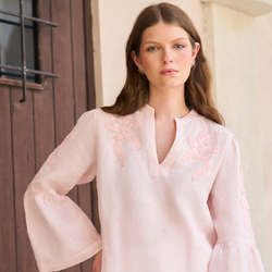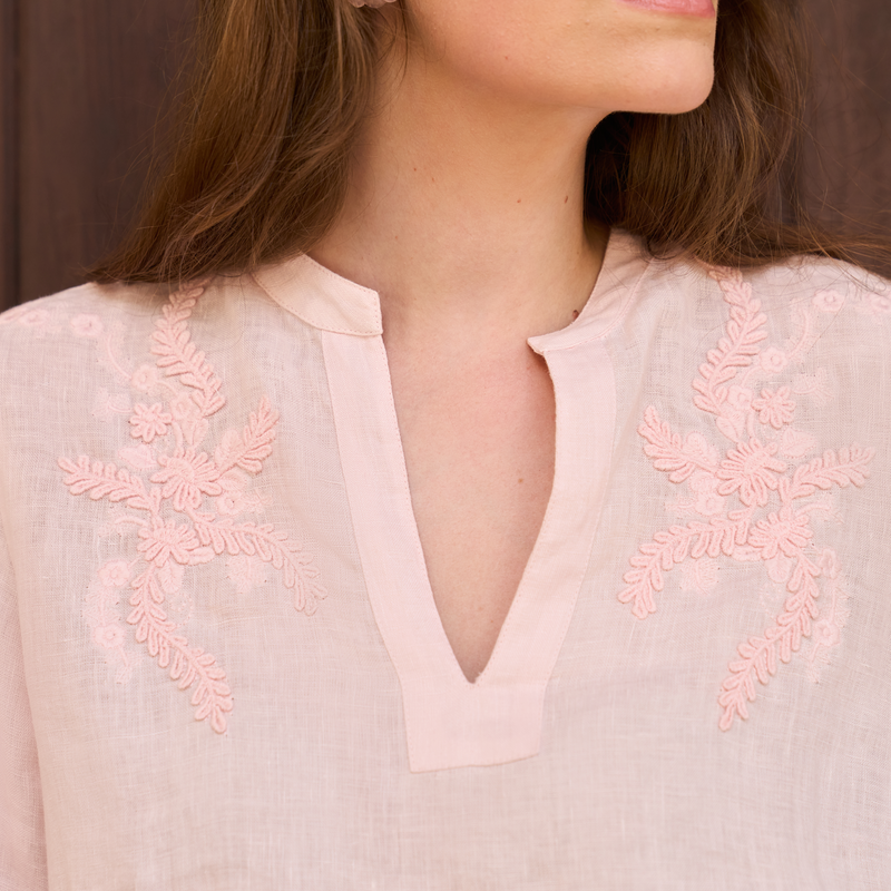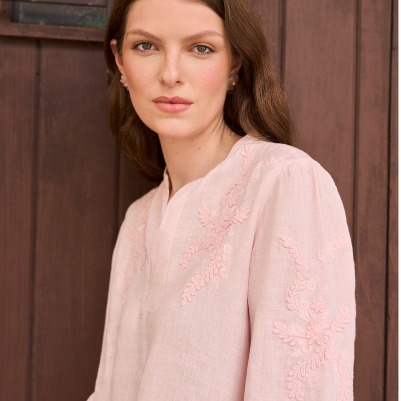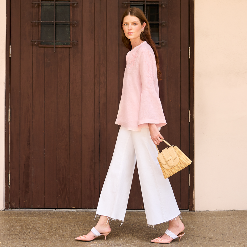 Breezy elegance with a sense of ease. The Worth blouse is crafted from airy linen and finished with tonal embroidery along the bodice and sleeves. Featuring a relaxed fit, with softly flared bell sleeves, this feminine silhouette adds quiet polish in the softest petal pink. Pair with tailored shorts or your favorite pair of white denim.