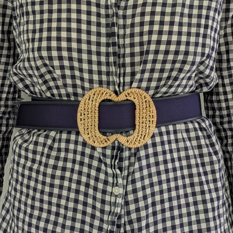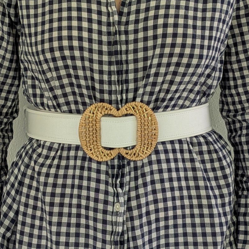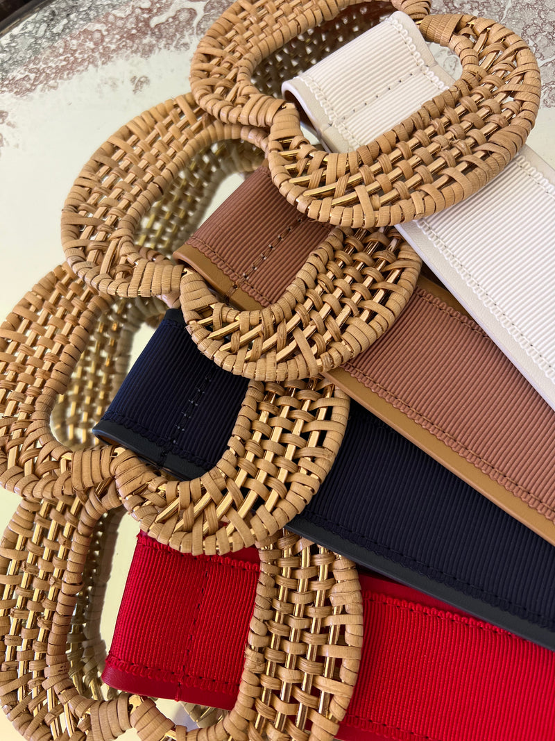 The finishing touch for your summer wardrobe. Handwoven rattan buckle, grosgrain ribbon mounted calfskin leather belt.