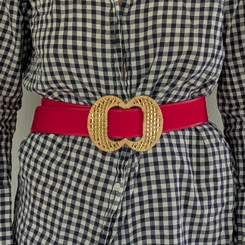 - Handwoven rattan buckle with calfskin leather and grosgrain belt