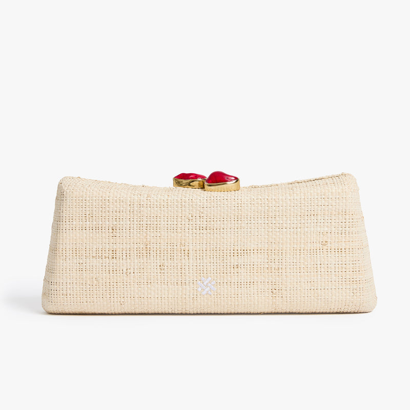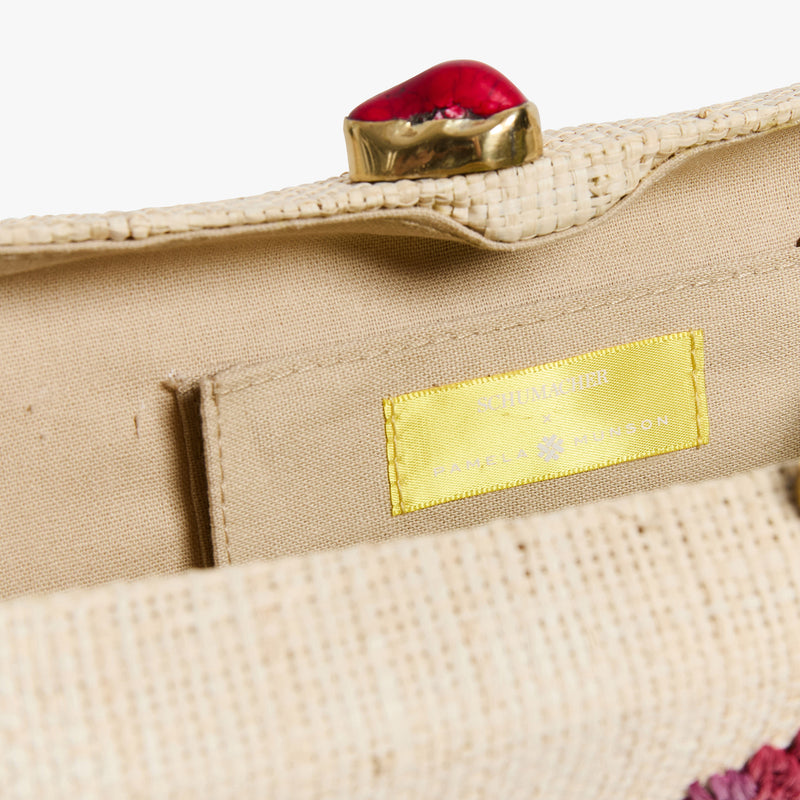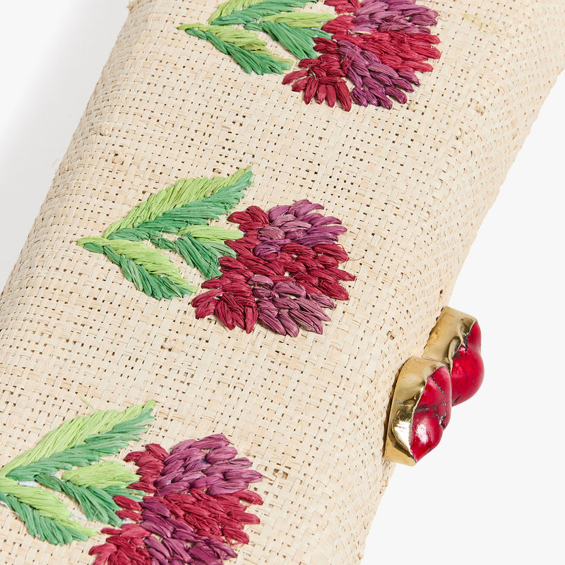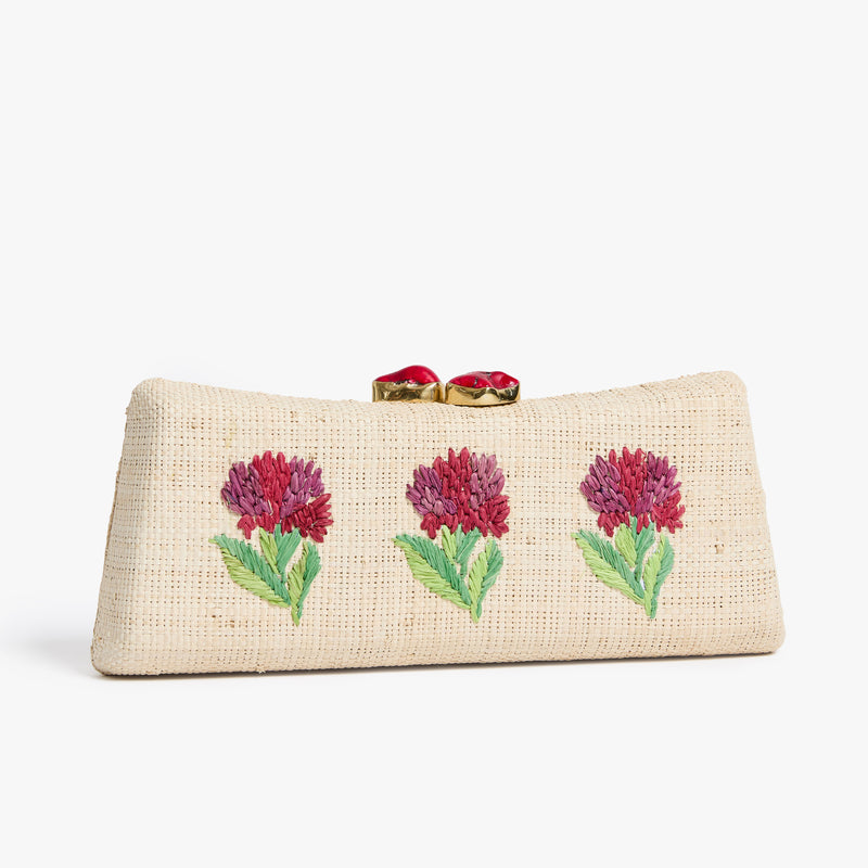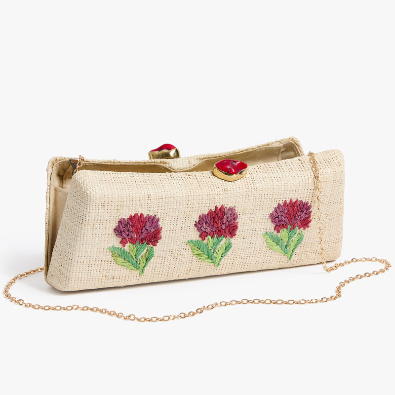 - Straw minaudière with hand-embroidered block print floral motif and semi-precious stone top closure